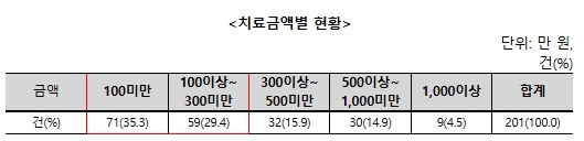 □ (치료금액별) 소비자가 선납한 치료금액은 300만 원 미만이 64.7%(130건)로 대부분을 차지함.