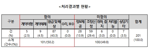 □ (처리결과별) 진료비 관련 분쟁이 양 당사자간 합의로 처리된 것은 절반 수준(50.2%)인 것으로 나타남.