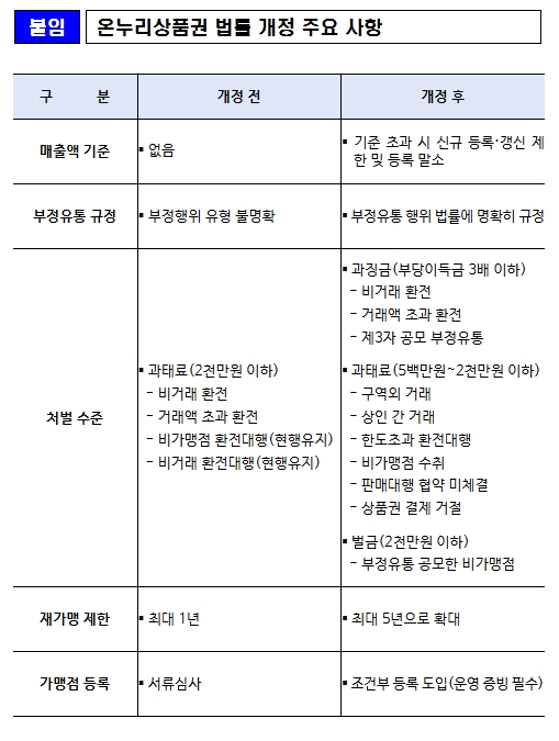 - 실질적 영세 소상공인 지원을 위해 가맹점 매출액 기준 도입, 온누리상품권 부정유통 행위 명확화・처벌 강화, 가맹점 등록 절차 개편・관리 강화