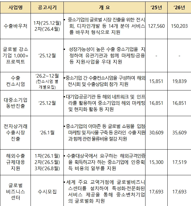 2026년 중소기업 수출지원사업 주요 내용은 다음과 같다.