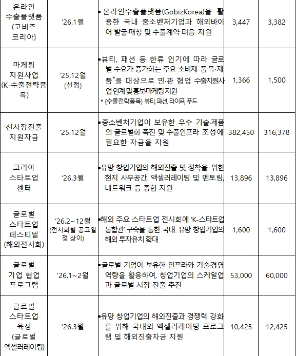 이순배 글로벌성장정책관은 “미 관세 등 대외환경 불확실성이 여전히 높아 수출 중소기업의 애로와 우려의 목소리가 커지고 있는 상황이다”라며, “이런 상황을 감안해 ’26년도 중소기업 수출지원사업 통합공고 시기를 앞당겼으며, 중소기업들에게 수출자금이 신속하게 지원될 수 있도록 하겠다”고 밝혔다.