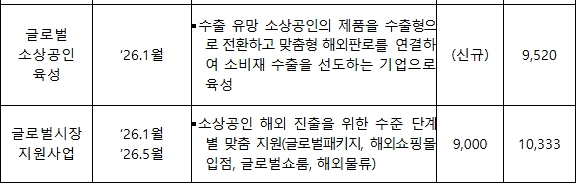 유망 소상공인 제품을 수출형으로 전환하고 맞춤형 해외판로를 지원하는 95.2억원 규모의 ‘글로벌 소상공인(K-소상공인) 육성사업’을 신설한다. 수출 유망 소상공인을 대상으로 소비재 수출 특화교육, 수출용 비즈니스 모델 전환 등을 패키지로 지원할 예정이다.