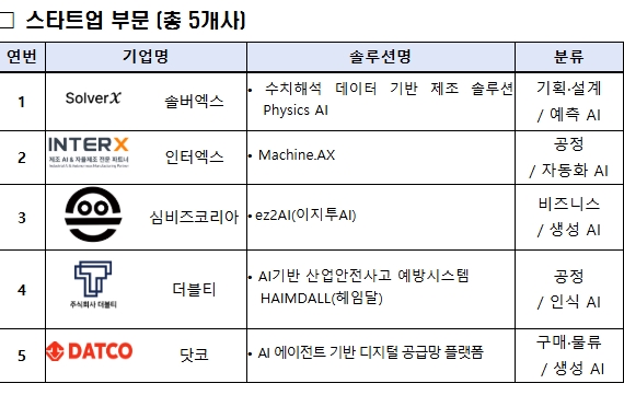 영예의 대상에는 스타트업 부문 ㈜더블티, 글로벌·도약 부문 ㈜시즐이 선정되었다. ㈜더블티의 ‘HAIMDALL 산업안전 AI’는 고정밀 위치 추적과 AI 위험패턴 분석으로 실시간 경보를 제공하는 AI 기반 산업안전사고 예방시스템이다. ㈜시즐의 ‘SIZL Agentic 제조 AI Copilot’은 AI가 문제 진단부터 개선 제안, 실행 추적까지 담당하는 지속형 제조 컨설팅 에이전트를 제공하여 컨설팅 비용 절감 및 분석 속도 향상에 기여한다. 이 외, 우수상에는 ㈜솔버엑스의 Physics AI 기반 해석·시뮬레이션 솔루션 ‘AI Solver’, ㈜퍼즐데이터의 AI 프로세스 마이닝 기반 스마트 팩토리 운영혁신 플랫폼 ‘ProDiscovery’가 선정되었다.