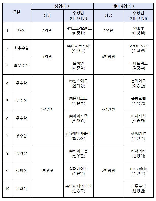 그 외에도 이지코리아, 브이엔은 창업리그 최우수상을, PROFUSIO(프로퓨지오), 더마트릭스는 예비창업리그 최우수상을 수상하는 등 총 20개 팀이 수상의 영예를 안았다.