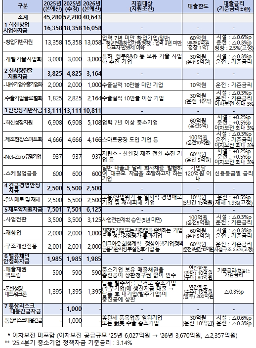 ’26년도 중소기업 정책자금은 창업기, 성장기, 재도약기 등 기업의 성장단계별로 지원대상을 구분하여 맞춤 지원한다. 구체적으로, 업력 7년 미만 창업기업을 위한 혁신창업사업화자금 1.6조원, 성장기에 있는 기업을 위한 신시장진출지원자금 및 신성장기반자금 1.7조원을 지원할 계획이다. 아울러, 경영애로 기업 지원을 위한 긴급경영안정자금 0.25조원 등을 공급하여 정책 목적에 따라 정책자금을 맞춤 지원할 계획이다.