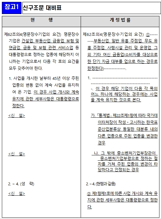 중소벤처기업부(장관 한성숙, 이하 중기부)는 명문장수기업의 선정 대상업종을 확대하고, 업종 유지 요건을 합리적으로 개선하는 내용을 담은「중소기업진흥에 관한 법률」일부개정법률 공포안이 23일(화) 국무회의에서 의결되었다고 밝혔다.