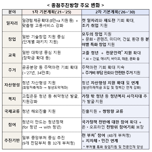 □ 정부는 ‘제2차 청년정책 기본계획(’26~’30)’을 바탕으로 내년부터 각 부처에서 구체적인 연도별 시행계획을 마련해 분야별 맞춤형 청년정책을 추진할 계획이며,