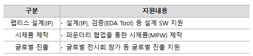 ◦ (사업목적) AI(NPU 등), 전력 등 팹리스 스타트업에 설계자산(IP), 시제품 제작(MPW) 등을 일관 지원하여 초격차 스타트업으로 연계