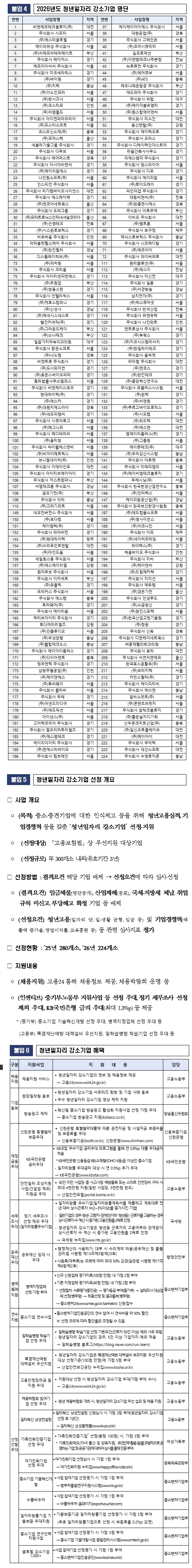 중소벤처기업부(장관 한성숙)는 31일(수) 고용노동부(장관 김영훈)와 함께 청년고용 실적과 기업경쟁력 등을 갖춘「2026년도 청년일자리 강소기업」 224개소를 선정·발표했다.