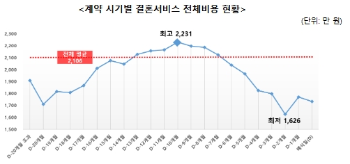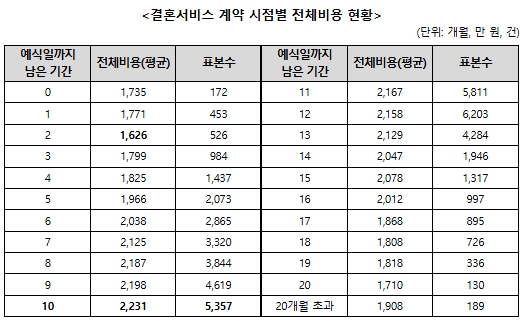 결혼서비스 비용은 예식일로부터 10개월 전 계약 시 2,231만 원으로 가장 높았고, 2개월 전 계약 시에는 1,626만 원으로 가장 낮았다.