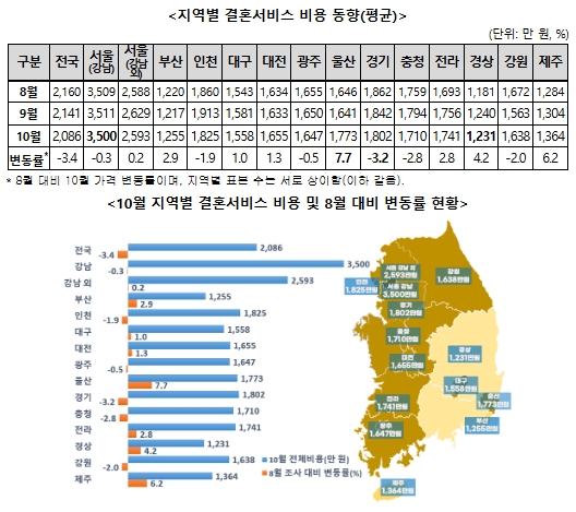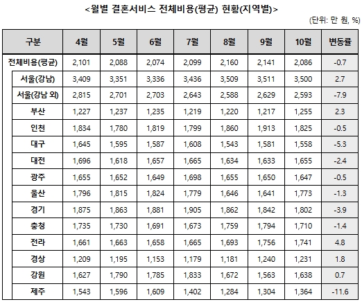 10월 조사결과 결혼서비스 전체비용은 2,086만 원으로, 이전 조사인 8월(2,160만 원)보다 3.4%(74만 원) 하락했다. 지역별로는 ‘서울(강남)’이 3,500만 원으로 가장 높았고, ‘경상’이 가장 낮은 1,231만 원으로 조사됐다.