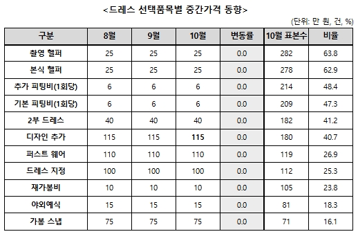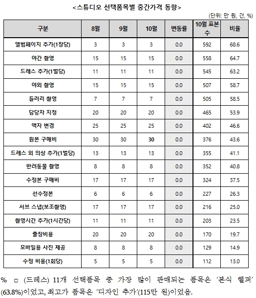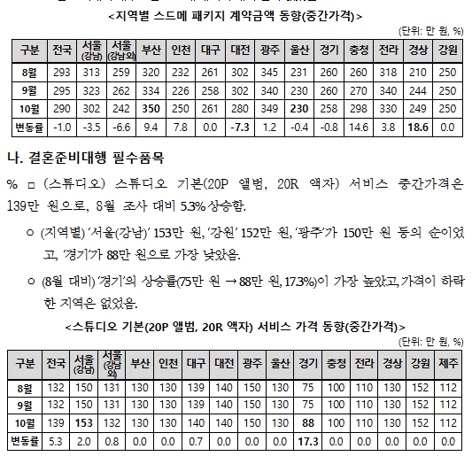 스튜디오, 드레스, 메이크업을 하나로 묶은 스드메 패키지 가격은 이전 조사보다 1.0% 하락(293만 원 → 290만 원)한 반면, ‘스튜디오’ 개별 기본가격은 5.3% 상승(132만 원 → 139만 원)한 것으로 확인됐다.