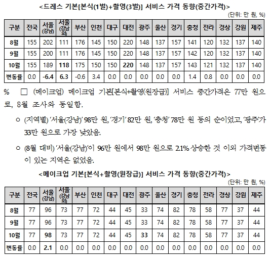 ㅇ (스드메 패키지) 중간가격 기준으로 4월 가격과 10월 가격이 동일했으며세부 품목 중 ‘스튜디오’ 기본서비스는 3.0%, ‘메이크업’ 기본서비스는 1.3% 상승했고, ‘드레스’ 기본서비스는 동일했음.