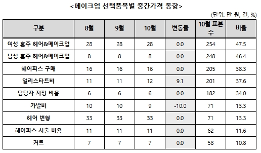 ㅇ (8월 대비) ‘얼리스타트비’는 9.1% 상승(11만 원 → 12만 원)하였고, ‘가발비’는 10.0% 하락(10만 원 → 9만 원)하였으며, 이외 품목은 가격변동이 없었음.