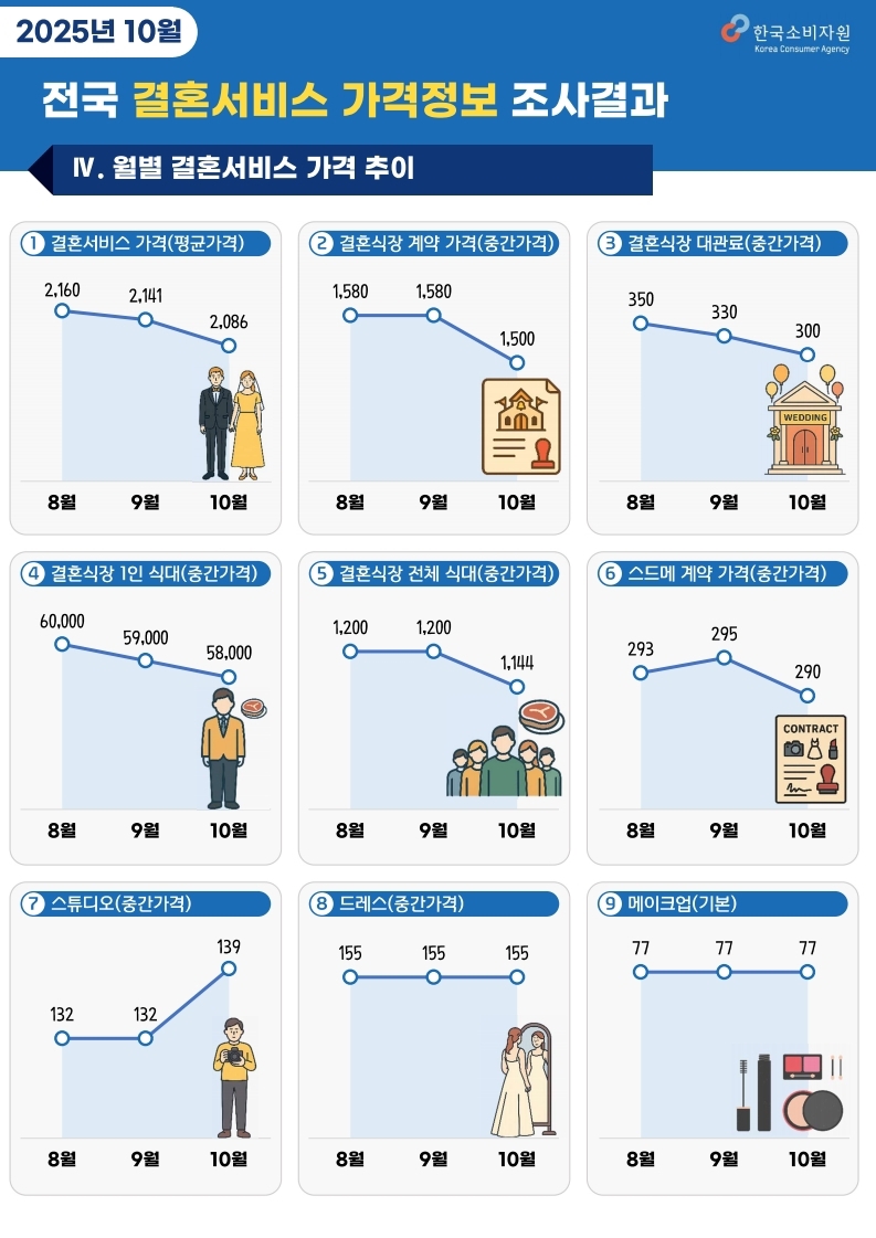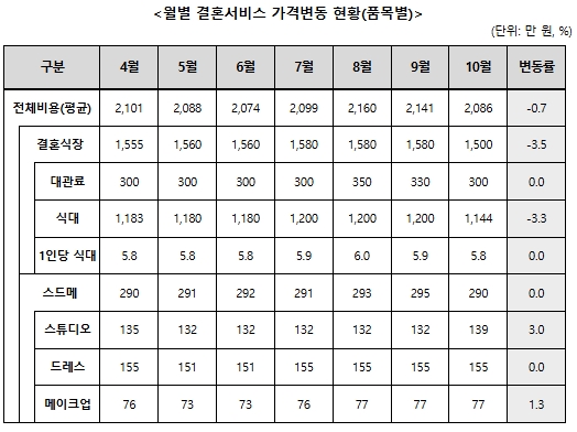 ** 최근 3개월간 결혼서비스 평균 비용 추이 : (8월)2,160만 원 → (9월)2,141만 원 → (10월)2,086만 원