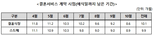 ㅇ (서비스별) 결혼식장은 4월 11.8개월에서 10월 8.6개월로 3.2개월 감소했고, 스드메는 11.1개월에서 8.9개월로 월평균 2.2개월 감소함.