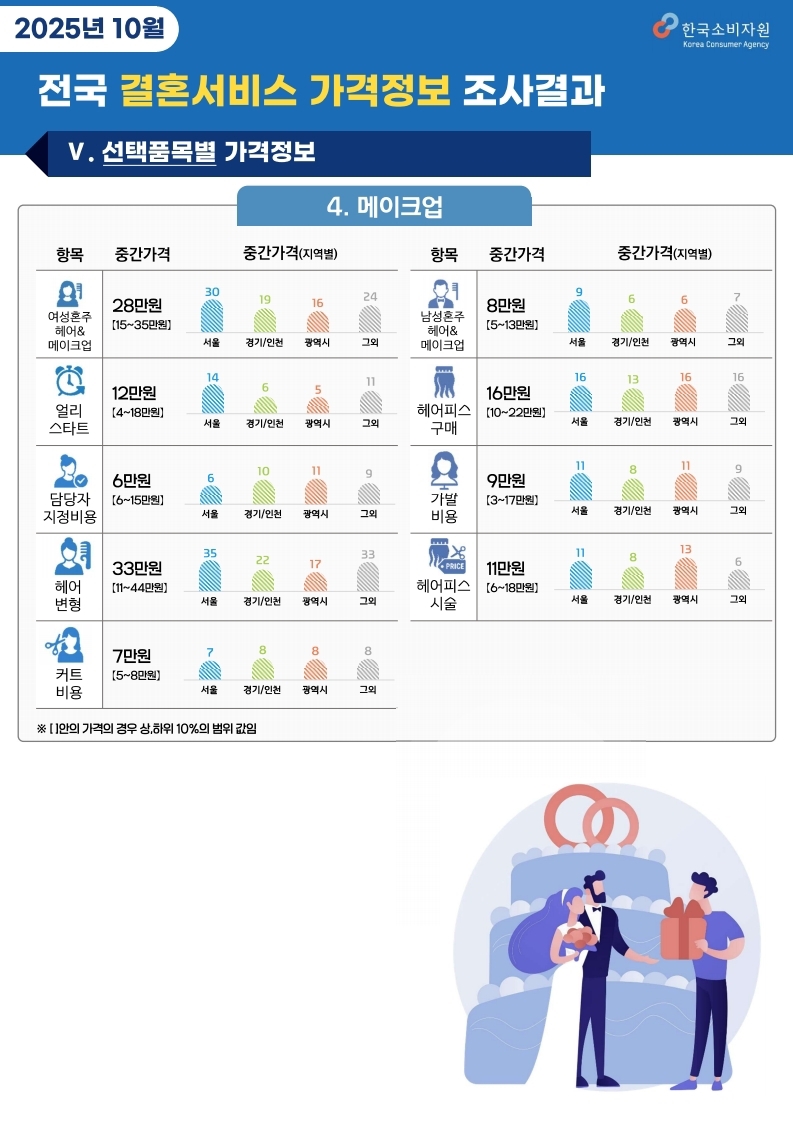 한국소비자원(원장 윤수현)이 전국 14개 지역 결혼서비스 업체 500개사를 조사한 결과, 10월 결혼서비스 전체비용*은 평균 2,086만 원으로, 지난 8월(2,160만 원) 이후 2개월 연속 하락한 것으로 나타났다. 결혼식장 대관료, 식대 하락의 영향이 일부 반영된 것으로 풀이된다.