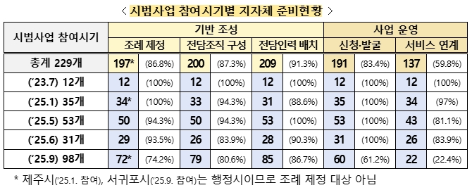 현재 116개 시군구에서는 조례·조직·인력·서비스 연계 등을 모두 갖춘 상태이나, 시범사업에 늦게 참여한 지자체일수록 준비 수준에 다소 차이를 보이고 있다.