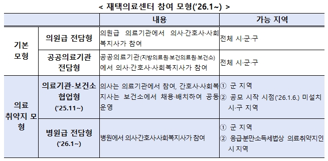 또한 이번 공모에서도 지난 공모(’25.10)에서 도입된 ‘의료기관-보건소 협업형’으로 참여할 수 있다. 해당 모형의 경우 의사는 의료기관, 간호사·사회복지사는 보건소에서 지원하는 방식으로 의료기관과 보건소가 공동으로 참여할 수 있다.