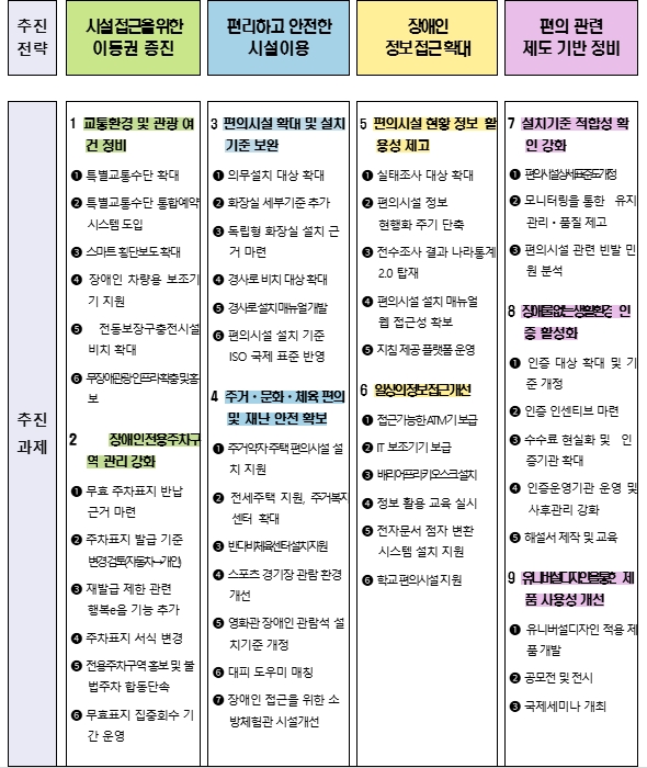 제6차 계획은 ▲시설 접근을 위한 이동권 증진 ▲편리하고 안전한 시설 이용 보장 ▲장애인의 정보 접근 확대 ▲편의 관련 제도 기반 정비의 4대 추진전략을 중심으로 9대 중점과제와 47개 세부과제를 담고 있다.