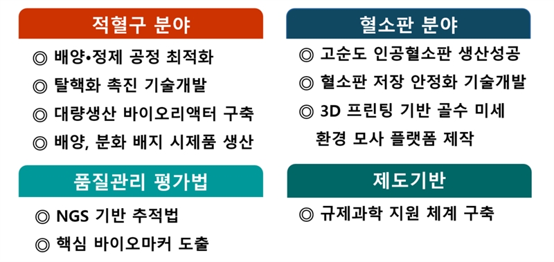 * 이 사업은 저출생·고령화 및 감염병 발생 등으로 인한 혈액 공급난 대비를 위해 줄기세포로부터 적혈구, 혈소판을 생산하고 상용화를 위한 기초·원천기술 확보를 목표로 2023년도부터 본격 추진 중이다. 복지부·과기부·산업부·식약처·질병청이 공동으로 추진하는 사업이며, 총사업 규모는 약 481억원에 이른다.