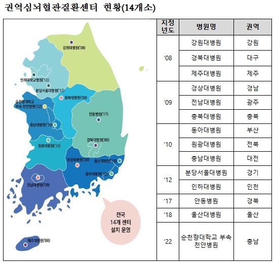 현재 지정된 심뇌혈관질환센터는 중앙심뇌혈관질환센터 1개소(서울대학교병원), 권역심뇌혈관질환센터 14개소*, 지역심뇌혈관질환센터 10개소**이며, 이번 공모를 통해 권역심뇌혈관질환센터 1개소 및 지역심뇌혈관질환센터 4개소를 추가로 지정할 예정이다.