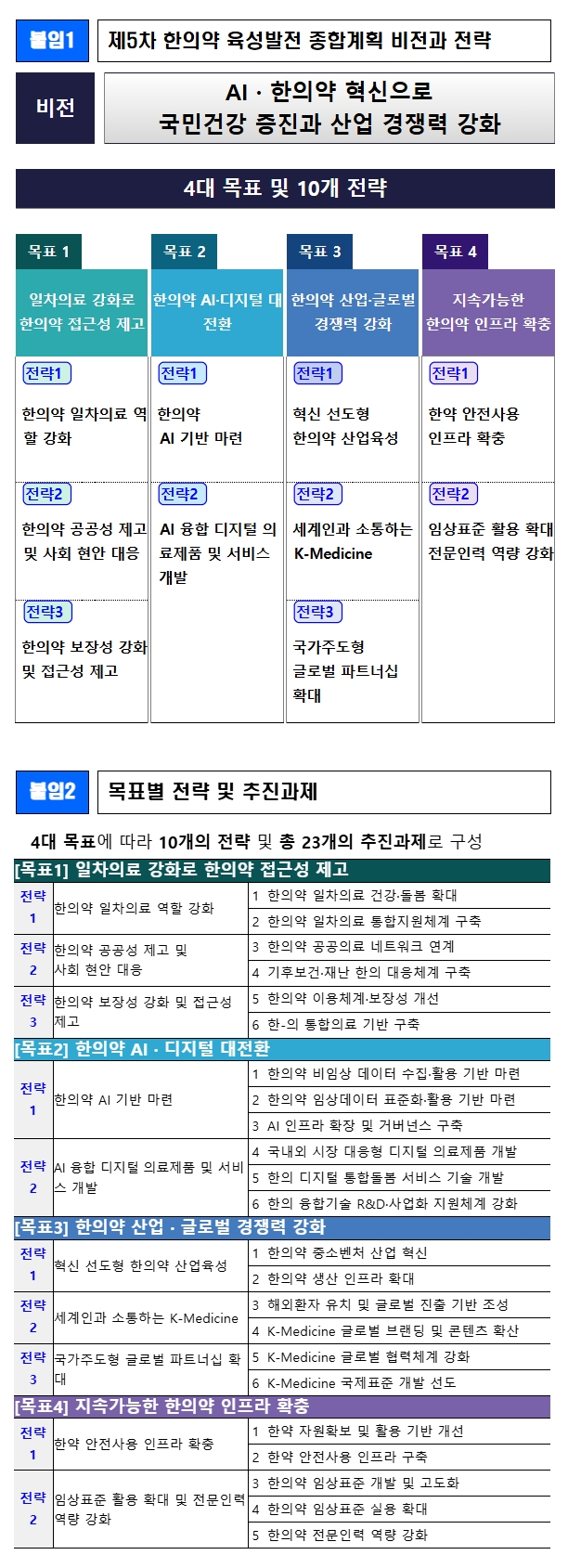 제5차 종합계획은 AI·한의약 혁신을 통한‘국민건강 증진’과‘한의약 산업 경쟁력 강화’를 비전으로 설정하고, 일차의료 기반 건강돌봄 수요 충족과 한의약 산업발전 육성·시장 확대에 대한 5개년 발전 방향을 제시하였다.