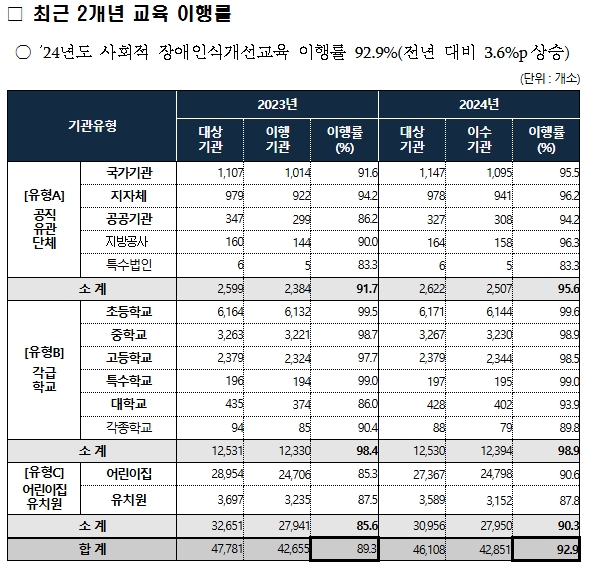 2024년 사회적 장애인식개선교육 의무 대상 46,108개 기관 중 42,851개 기관이 교육을 완료하였다. 기관유형별로는 각급학교(유형B)가 98.9%로 가장 높은 이행률을 보였으며, 공직유관단체(유형A)가 95.6%, 어린이집·유치원(유형C)이 90.3%로 나타났다.