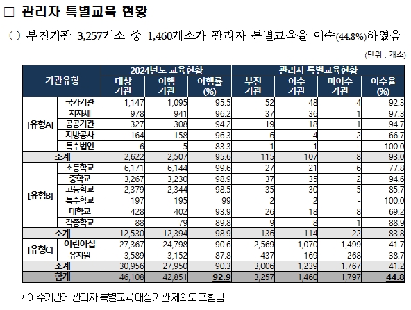 다만, 이번 점검에서 미입력·시스템 미가입(81.9%), 대면교육 미실시(16.4%)* 등 사유로 총 3,257개 기관이 부진기관으로 확인됐다. 이 중 관리자 특별교육** 까지 미이수한 기관은 1,797개소로 공직유관단체 8개소, 각급학교 22개소, 유치원 268개소, 어린이집 1,499개소로 나타났다.