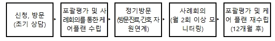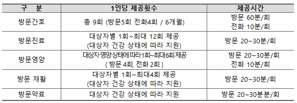 - 담당 간호사를 중심으로 간호, 재활, 영양 등 필요 방문의료 서비스를 연계, 조정, 중재하여 대상자에게 통합간호서비스 제공