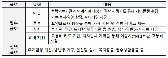 ○ (필수급여) 의료(케어플랜), 돌봄(가사·간병), 식사(도시락), 이동(교통비)지원
