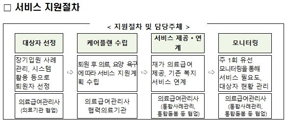 ○ (목적) 장기입원 필요성이 낮음에도 입원 중인 의료급여 수급권자에게 거주지에서 적절한 케어를 제공하여 지역사회에 정착할 수 있도록 지원