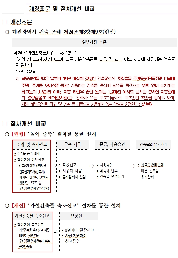 지난해 12월 26일 개정․공포된 대전시 건축조례는 ▲사용승인을 받은 날부터 15년 이상 경과 ▲최상층을 주거용도로 사용하는 건축물 ▲건축사 또는 구조기술사의 구조안전 확인 등 일정 요건을 충족할 경우, 옥상 비가림지붕을 신고를 통해 설치가 가능토록 규제를 완화했다.