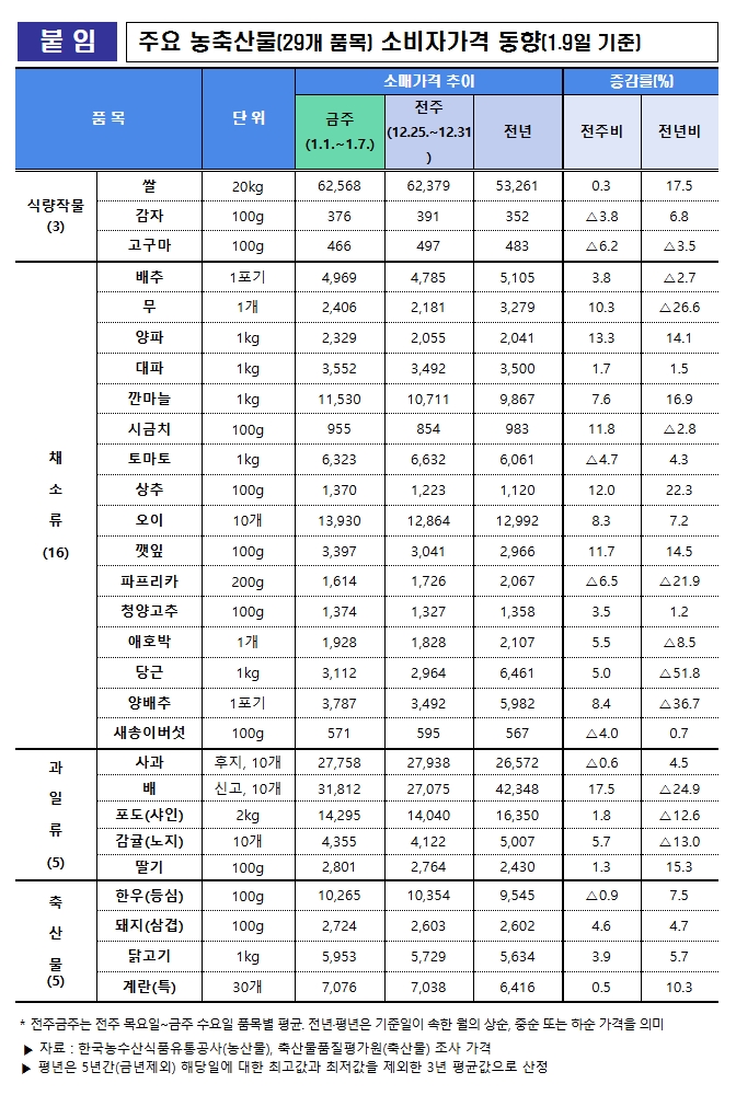 * 1월 중점품목: 쌀, 배추, 무, 마늘, 사과, 감귤, 딸기, 한우, 돼지, 계란