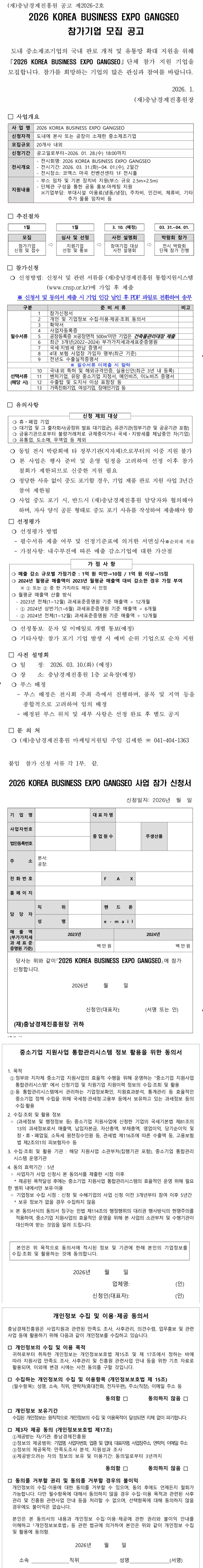 충청남도 내 중소제조기업의 국내 판로 개척 및 유통망 확대 지원을 위해 「2026 KOREA BUSINESS EXPO GANGSEO」단체 참가 지원 기업을 모집합니다. 참가를 희망하는 기업의 많은 관심과 참여를 바랍니다.