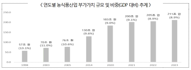‘23년 농식품산업 부가가치 211조 원, 전체 산업의 8.9% 차지하는 것으로 나타나