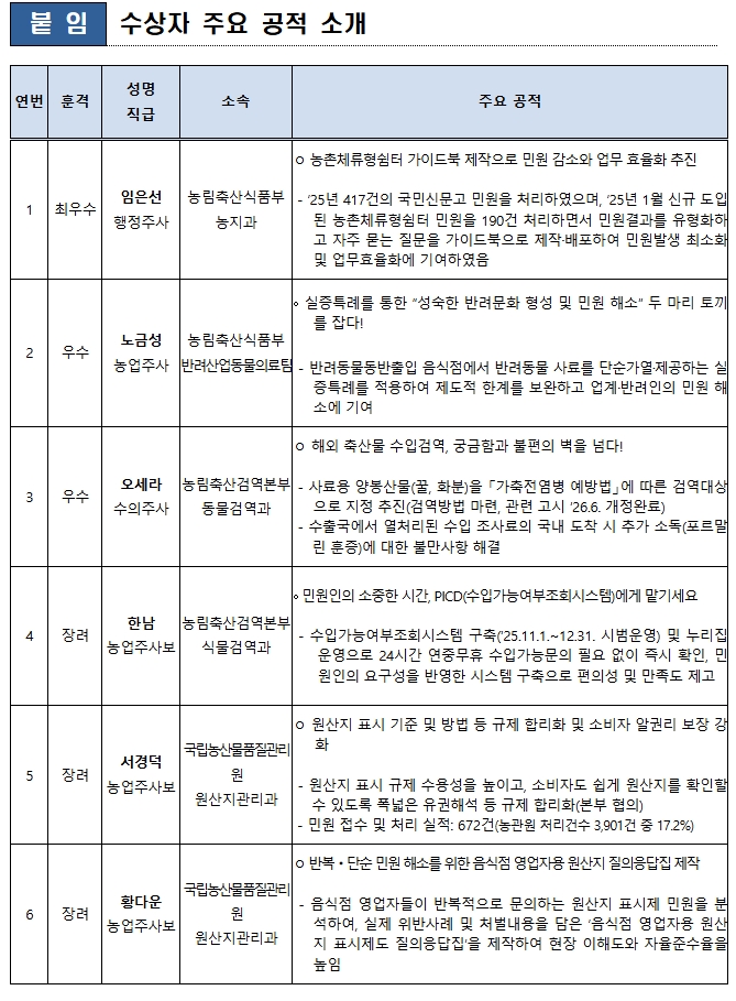 농림축산식품부(장관 송미령)는 ‘2025년 국민신문고 민원처리 우수공무원’ 수상자로 농지과 임은선 주무관(최우수), 반려산업동물팀 노금성 주무관 · 농림축산검역본부 오세라 주무관(우수), 농림축산검역본부 한남 주무관 · 국립농산물품질관리원 서경덕 주무관 · 황다운 주무관(장려)이 선발되었다고 밝혔다. 농림축산식품부가 올