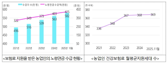 농림축산식품부(장관 송미령, 이하 농식품부)는 농업인의 사회안전망 보장을 위해 실시하고 있는 ‘농업인 연금·건강보험료 지원’에 대해 2026년부터 ▲연금보험료 지원 기준소득금액 인상 ▲건강보험료 최대 지원금액 인상 ▲건강보험료 소급 지원기간 연장 등을 개선한다고 밝혔다. ‘농업인 연금·건강보험료 지원’은 농업인의