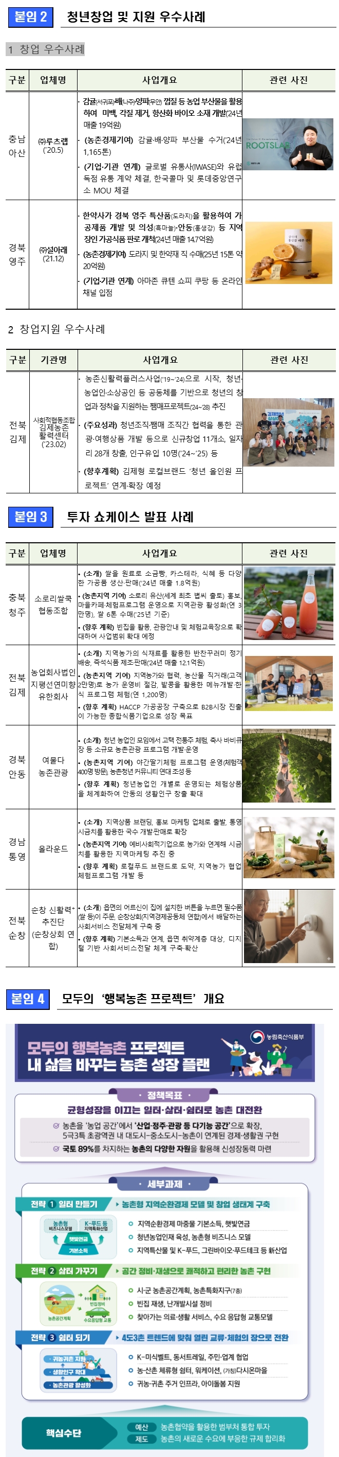 농림축산식품부(장관 송미령, 이하 농식품부)는 12월 18일(목) 서울 명동 커뮤니티 마실에서 「농촌창업 네트워크 간담회 및 투자 쇼케이스」를 개최하였다. 이번 행사는 농식품부가 추진하는「모두의 행복농촌 프로젝트」의 일환으로, 농촌형 비즈니스 모델 확산을 통해 농촌경제를 다각화하고 생활인구 유입과 지역 활력을 제