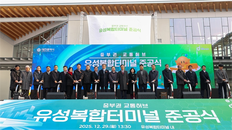 대전시는 29일 유성복합터미널 신축공사 준공식을 개최하고, 내년 1월 중 터미널 운영을 시작한다. 이날 준공식에는 이장우 대전시장, 조원휘 대전시의회 의장을 비롯해 유성구청장, 시․구의원 및 시민 등 500여 명이 참석해 오랜 기간 추진돼 온 사업의 준공을 함께 축하했다. 유성복합터미널은 대전 도시철도 1호선 구암