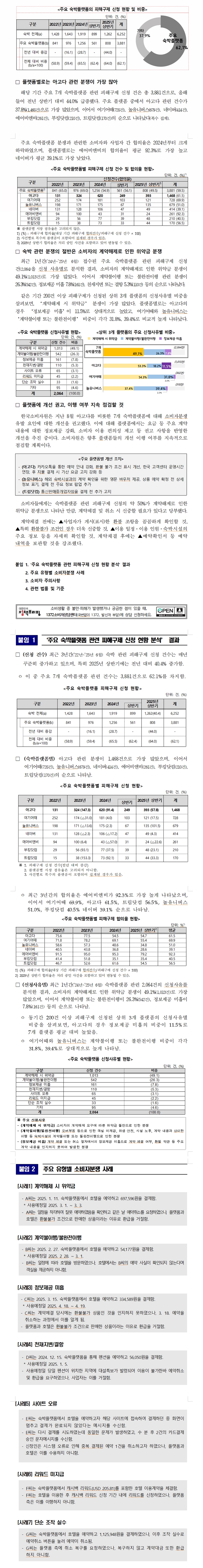 온라인 숙박플랫폼을 통한 숙박 이용계약 관련 분쟁이 급증하고 있어 소비자 주의가 필요하다. 최근 3년간(’22년~’25년 6월) 한국소비자원(원장 윤수현)에 접수된 숙박 관련 피해구제 신청은 매년 증가하고 있으며, 피해 다발 주요 7개 숙박플랫폼(이하 ‘주요 숙박플랫폼’)*의 비중은 62.1%에 달하는 것으로 나타났다