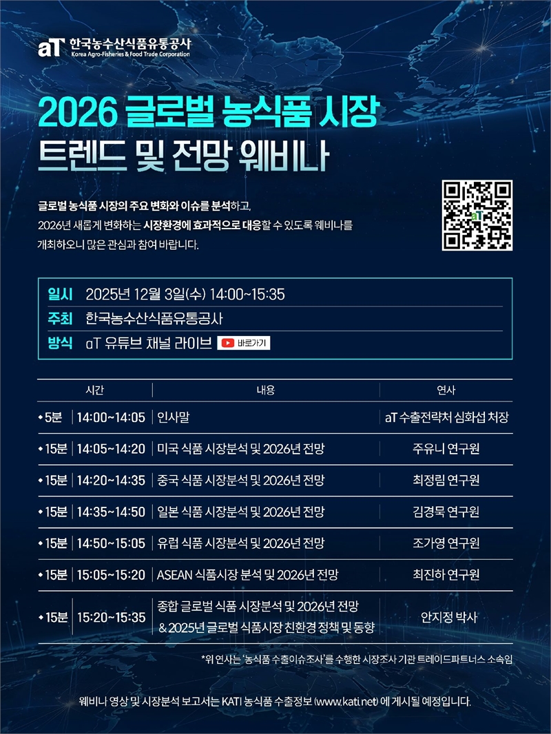 농림축산식품부(장관 송미령)와 한국농수산식품유통공사(aT, 사장 홍문표)는 3일 농식품 수출업체와 유관기관 관계자 250명을 대상으로 ‘2026 글로벌 농식품 시장 트렌드 및 전망 웨비나’를 개최했다. 이번 웨비나는 글로벌 농식품 시장의 주요 변화와 이슈를 분석해, 수출업체들이 2026년 새롭게 변할 시장환경에 효과적으