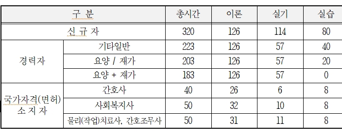 요양보호사 교육기관 및 자격관리 추진방침 ○ 노인장기요양 서비스 제공 인력인 요양보호사의 양성을 위하여 교육 수료 심사, 자격증 발급, 교육기관 지도·점검 실시 사업내용 ○ 요양보호사 교육기관 지정(변경) 민원 처리 ○ 교육기관 심사·승인: 수강·수료 및 변경 보고 적정 여부 검토 ○ 교육기관 운영 전반에 대한 정기