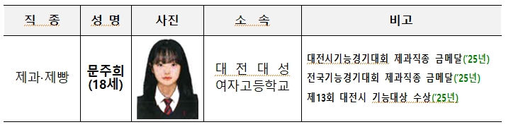 이장우 대전시장은 30일 고용노동부 주관, 올해 최초로 시행하는‘기특한 명장’에 선정된 대성여고 문주희 학생(3학년)을 초청해 격려했다. 문주희 학생은 ▲2025년 대전기능경기대회 제과직종 금메달 ▲2025년 제60회 전국기능경기대회 제과직종 금메달을 수상하는 등 각종 대회에서 탄탄한 기술력을 입증해 왔으며, 지난 11