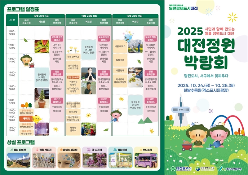 ‘시민과 함께 만드는 일류 정원도시 대전’이라는 주제로 열리는 이번 박람회는 정원 전시, 정원산업전, 문화프로그램, 부대행사 등 다채로운 내용으로 구성되어 정원도시의 비전을 시민들과 함께 나누는 자리가 될 것이다.