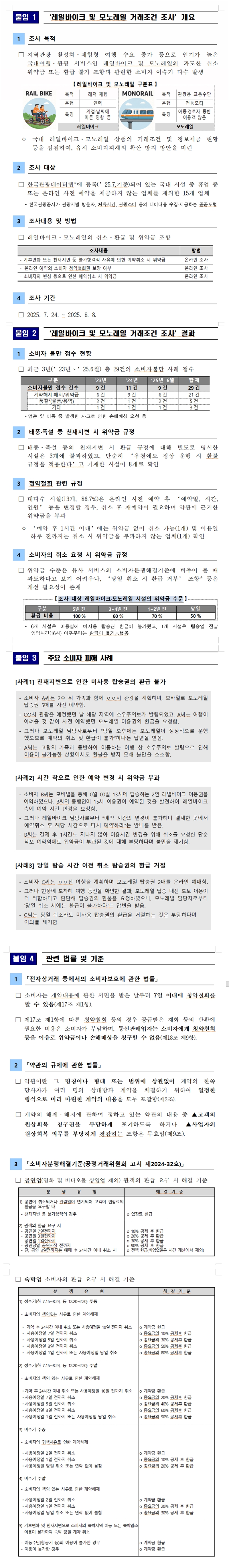 레일바이크와 모노레일은 아동·경로자를 동반한 가족 단위 이용이 많은 만큼 승객 안전 확보 등을 위해 기상 악화 시 운행 기준을 사전에 명확히 고지하고, 천재지변 시 위약금 면책 규정을 도입하는 등의 약관 개선이 필요했다.