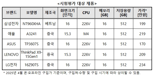 노트북은 업무와 일상에서 자주 사용하고 구매 가격대가 높아 소비자들의 관심이 높은 제품이다. 이에 한국소비자원(원장 윤수현)이 2025년 출시된 인기 노트북 5개 제품의 품질(휴대성·구동소요시간·디스플레이 품질·연속 사용가능시간 등), 안전성 등을 시험평가했다.