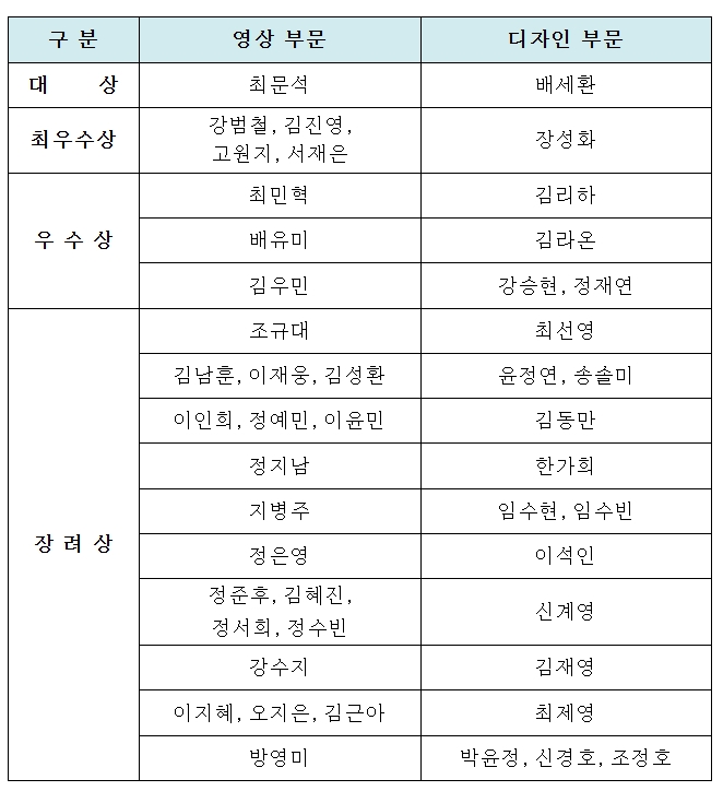 공모전 시상식은 12월 8일(월), 회의실 바이(by) 필원(서울 종로구)에서 열린다. 문체부 김대현 제2차관은 시상식 현장을 찾아 영상·디자인 부문별 대상과 최우수상을 시상하고 수상자들을 격려할 예정이다. 이번 시상식에서는 수상자들과 국정과제 담당 공무원들이 정책 홍보에 대한 궁금증을 해소하고, 영상 제작 과정에서 있었던 이야기들을 함께 나누는 ‘이야기 콘서트’도 마련했다. 개그맨 권재관이 ‘이야기 콘서트’를 진행하고 <개그콘서트>와 <1박 2일>, 드라마 <프로듀사> 등을 연출한 서수민 피디[(주)링가링 대표]가 ‘티브이(TV)에서 숏폼으로 트렌드 변화와 대응법’을 주제로 특강도 한다.