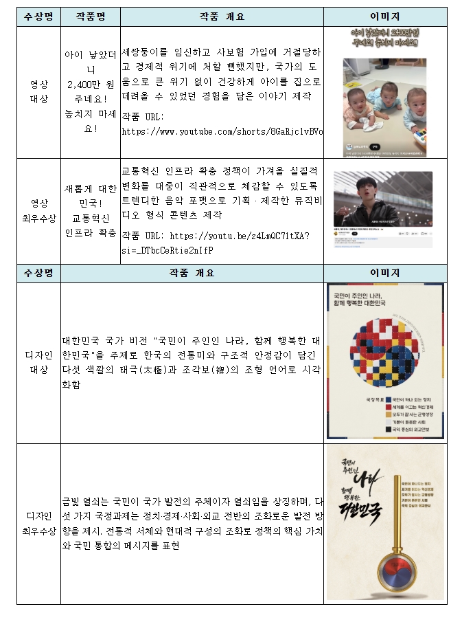영상 부문에서는 국정과제 ‘아이 키우기 좋은 출산‧육아 환경조성’과 관련해 본인 경험을 짧은 영상으로 담은 최문석 씨가 대상을 받는다. 올해 세쌍둥이 출산으로 4남매의 아빠가 된 수상자는 “내 또래 청년들에게 대한민국의 든든한 지원이 있다는 사실을 알리고 싶었다.”라며, ‘아이 낳았더니 2,400만 원 주네요! 놓치지 마세요!!’라는 제목의 영상을 통해 출산 현실의 어려움과 함께 미숙아 의료비 지원과 건강보험 제도 등, 실질적으로 도움이 되는 국가 정책을 소개했다. 이 영상은 유튜브 조회수 17만 회를 기록하며, 정부예산이 이렇게 쓰여야 한다는 호평을 받고 있다. ‘교통혁신 인프라 확충(국정과제57)’을 인공지능 음악으로 풀어낸 ‘새롭게 대한민국!(수상자 강범철, 김진영, 고원지, 서재은)’은 최우수상에 선정됐다.