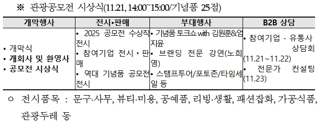 대한민국 대표 관광기념품들을 한자리에서 만날 수 있는 축제의 장이 열린다. 문화체육관광부(장관 최휘영, 이하 문체부)는 한국관광공사(사장직무대행 서영충)와 함께 11월 21일(금)부터 23일(일)까지, 동대문디자인플라자(DDP) 아트홀 1·2관에서 ‘2025 대한민국 관광기념품 박람회’를 개최한다. 문체부 김대현 제2차관은 11월 21일(금), 현장을 찾아가 국내 유일 관광기념품 박람회의 시작을 알리고 공모전 수상자들을 격려할 예정이다.